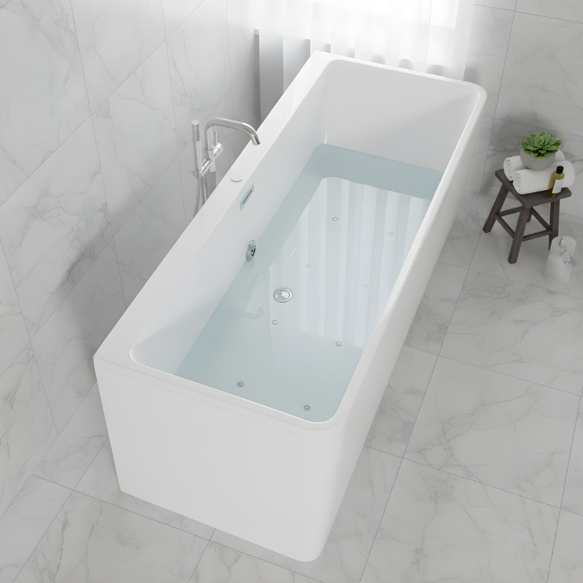 Transform your bathroom into a spa-inspired retreat with LAVISH 02570 Air Bubble Freestanding Bathtub. Crafted from 100% premium acrylic and reinforced with FRP, this tub is both lightweight and long-lasting, ensuring easy installation and years of reliable use. The modern design features an 8-jet air bubble system that delivers a soothing, spa-like experience, while the included overflow and drainer offer practical convenience. Perfect for relaxing solo soaks or unwinding after a long day, this freestanding bathtub combines elegant style with functional comfort.