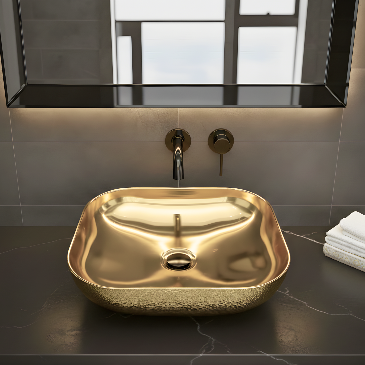 Upgrade your bathroom with the LAVISH 318 19.7″ Square Gold Plated Ceramic Vessel Sink, a perfect combination of elegance, modern design, and functionality. Featuring a luxurious gold-plated finish, this above-counter basin creates a bold focal point while complementing simple and luxury bathroom aesthetics. Crafted from high-quality ceramic, it is durable, chip-resistant, and easy to maintain, ensuring long-lasting beauty. The square design maximizes counter space while providing a stylish and functional basin for everyday use. Ideal for homeowners and designers looking for a luxurious, modern bathroom centerpiece.