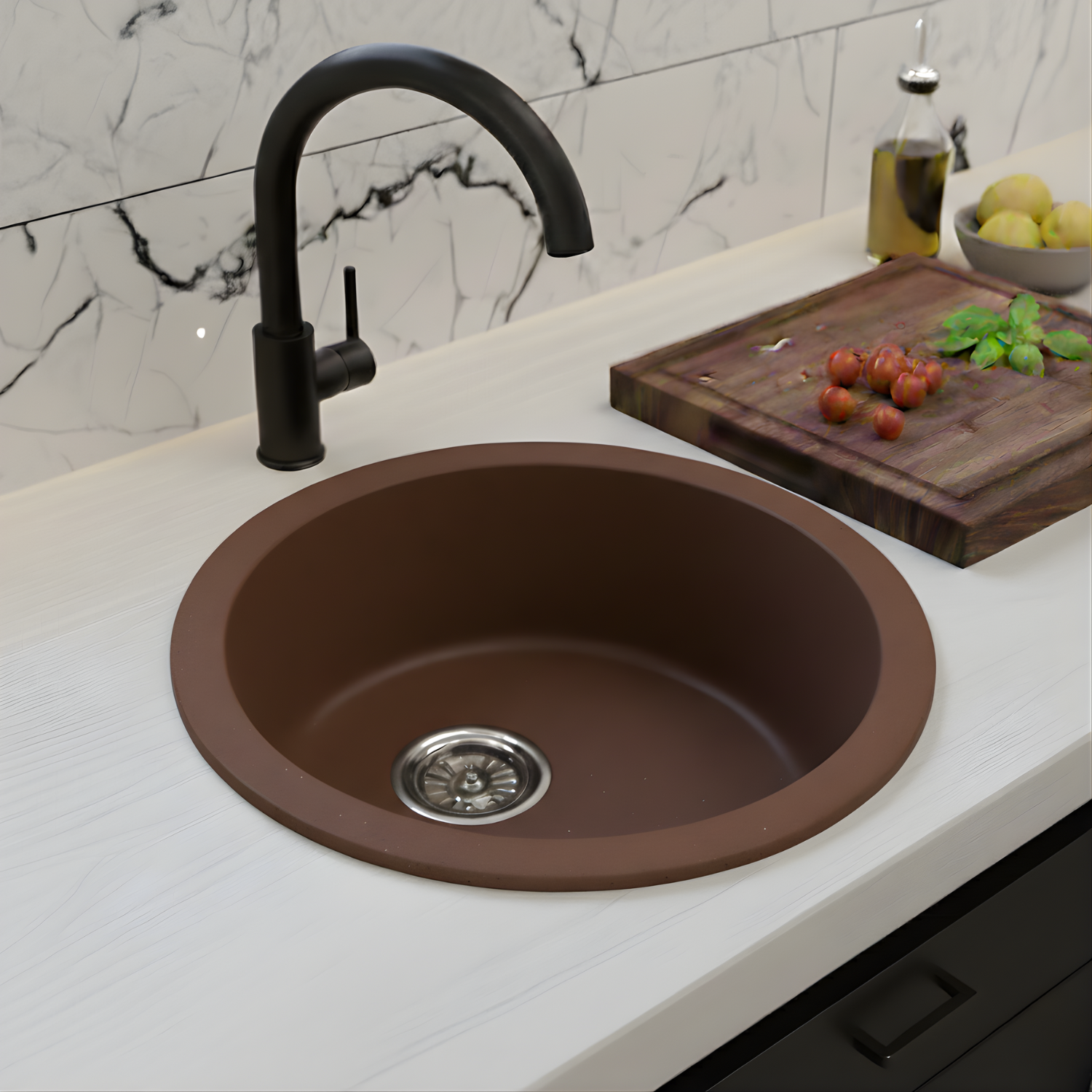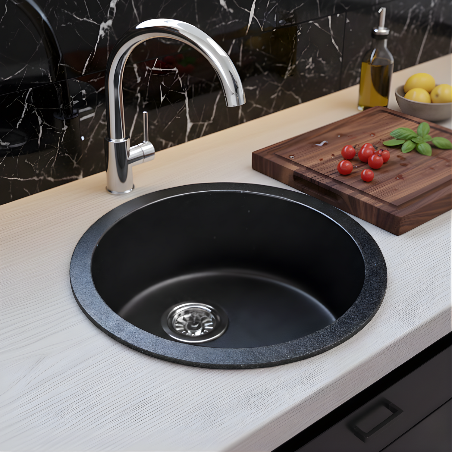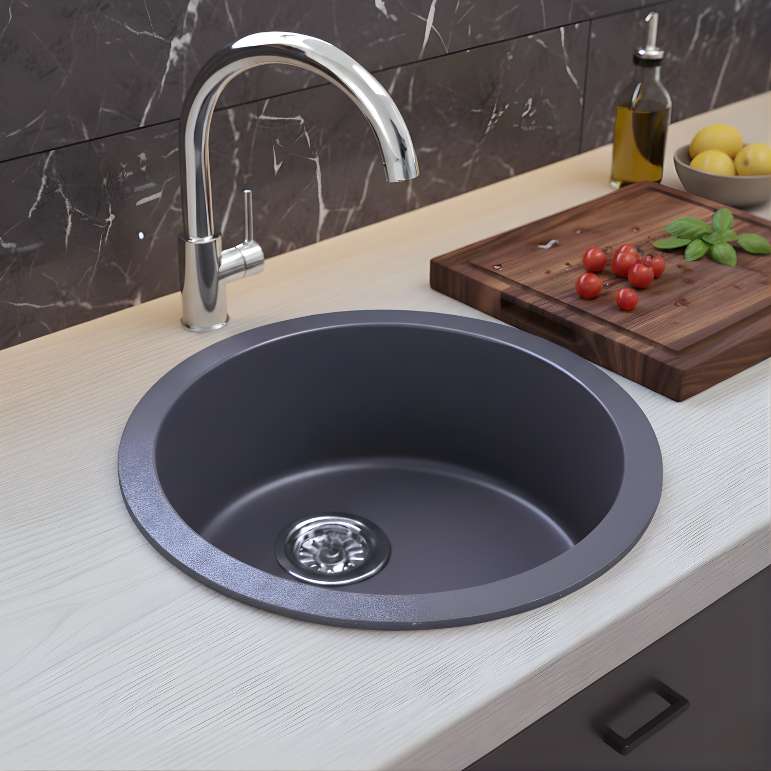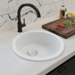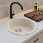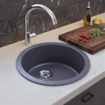 Elevate your kitchen functionality and style with the LAVISH 4545L 17.75″ Round Kitchen Sink with Strainer. Made in Germany from SILGRANIT®, a premium granite composite, this kitchen sink is built to endure daily wear and tear from heavy cookware, hot bakeware, and scuff marks, maintaining its sleek, modern look for years. The food-safe surface ensures maximum hygiene by protecting against bacteria, while the rear-positioned drain maximizes usable bowl space and cabinet storage, making it perfect for busy kitchens with limited space. Designed for both undermount and drop-in installation, this versatile kitchen sink easily integrates into a variety of kitchen styles, and the stainless steel strainer adds durability and convenience, completing a functional and stylish upgrade.