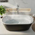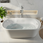 Elevate your bathroom with LAVISH 2838 62.6″ Oval Freestanding Bathtub with Top Center Drain. Its sleek elongated oval shape and top center drain offer a relaxing soak while adding modern elegance and style to any bathroom space.