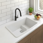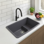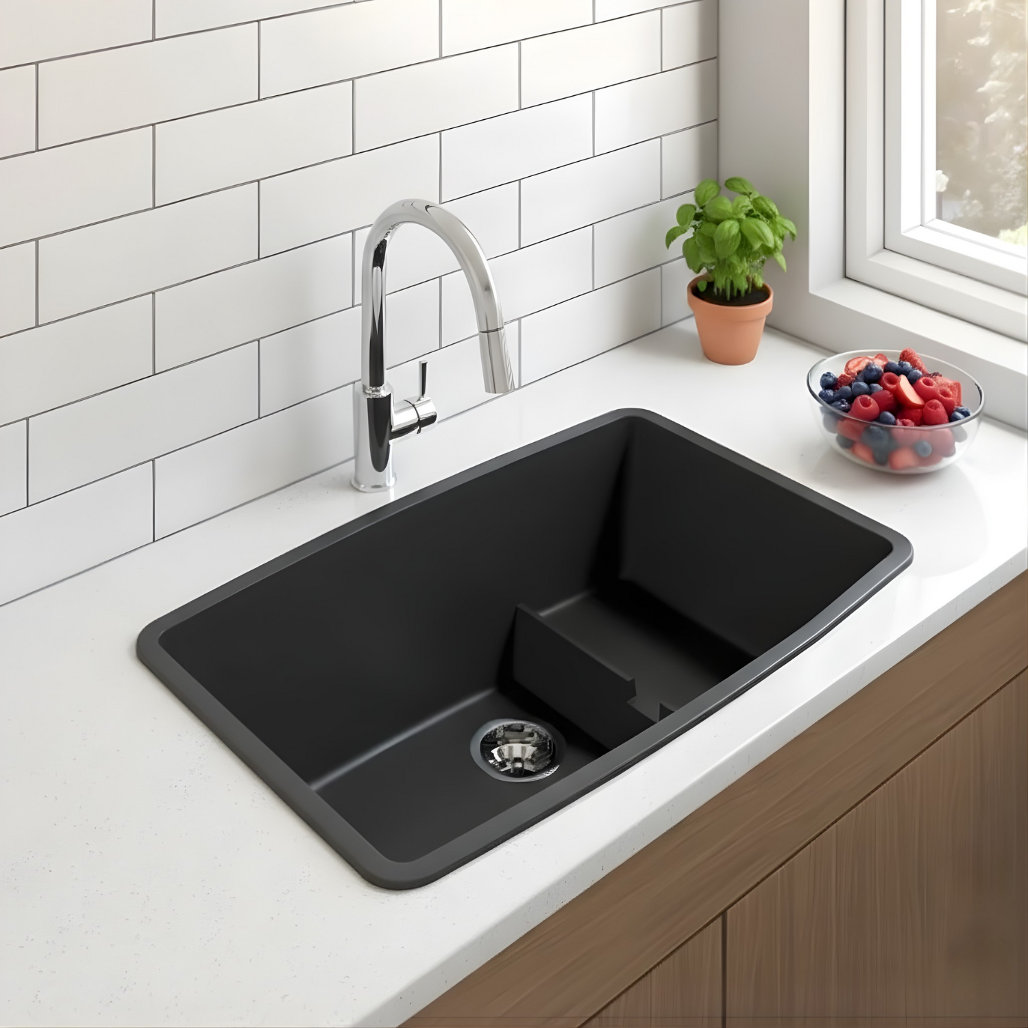 Upgrade your kitchen with the LAVISH 8149LB 32″ Rectangular Kitchen Sink with Strainer. Made from premium SILGRANIT® granite composite in Canada and Germany, it resists heat, scratches, and heavy cookware while maintaining a food-safe, hygienic surface. Rear-positioned drain maximizes usable bowl and cabinet space.