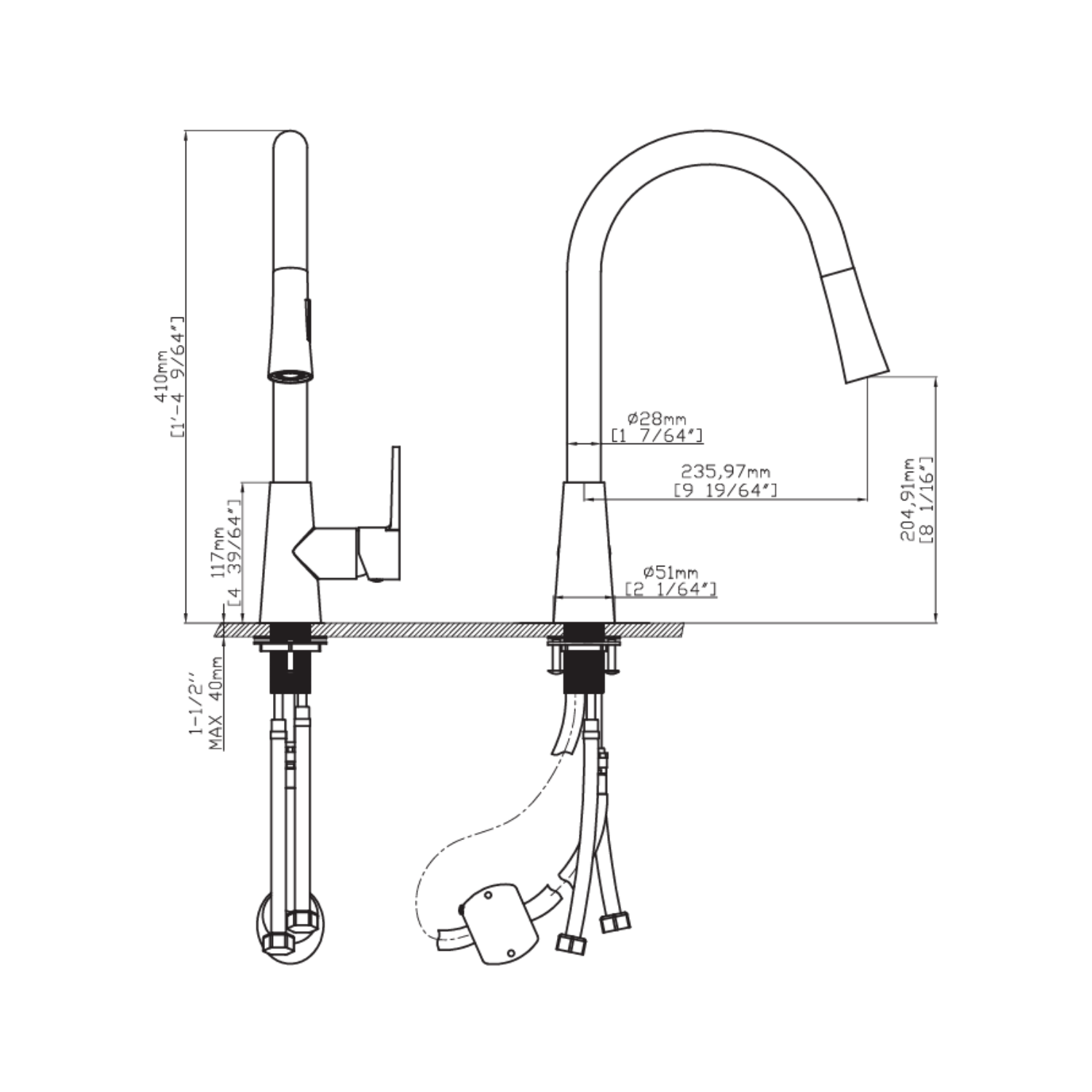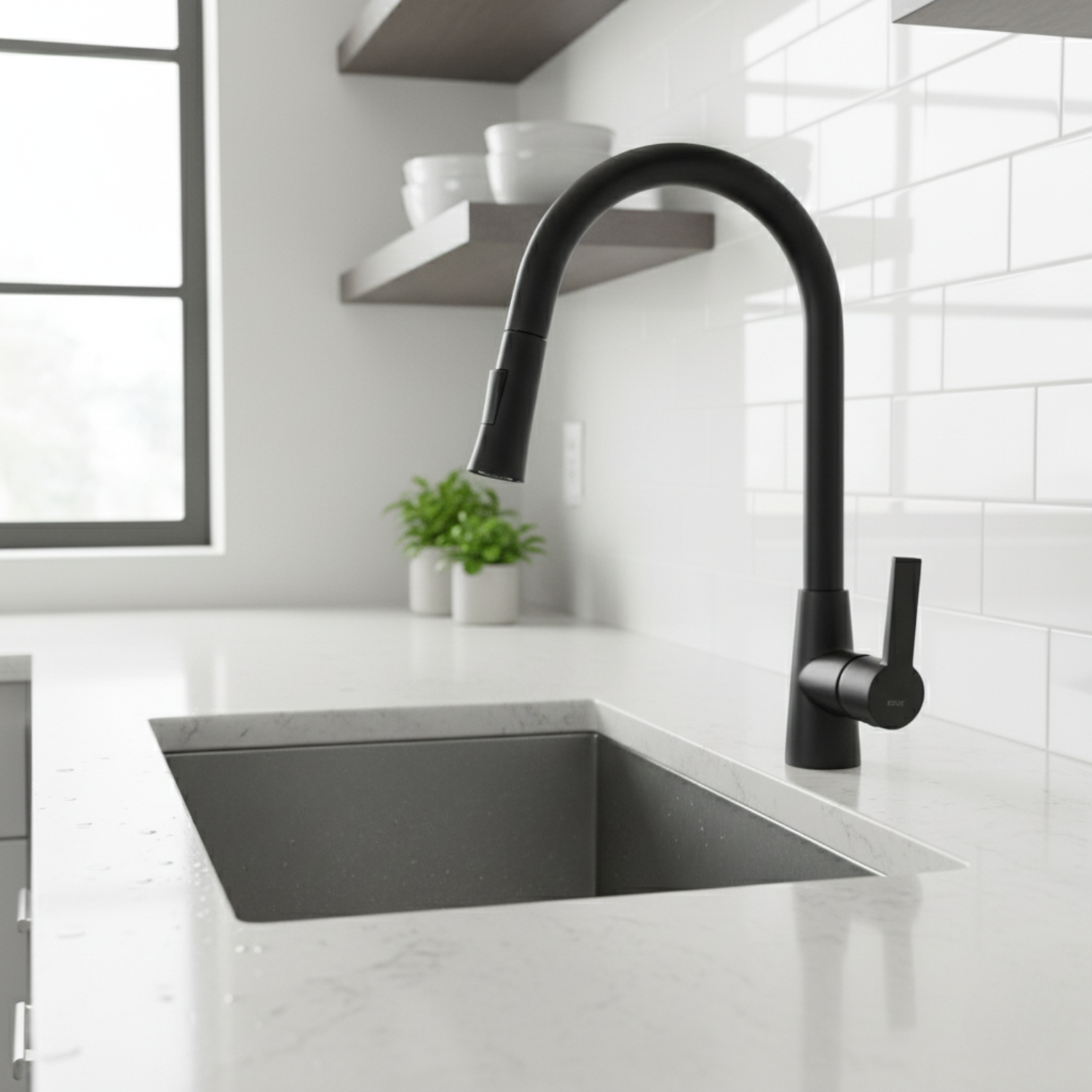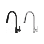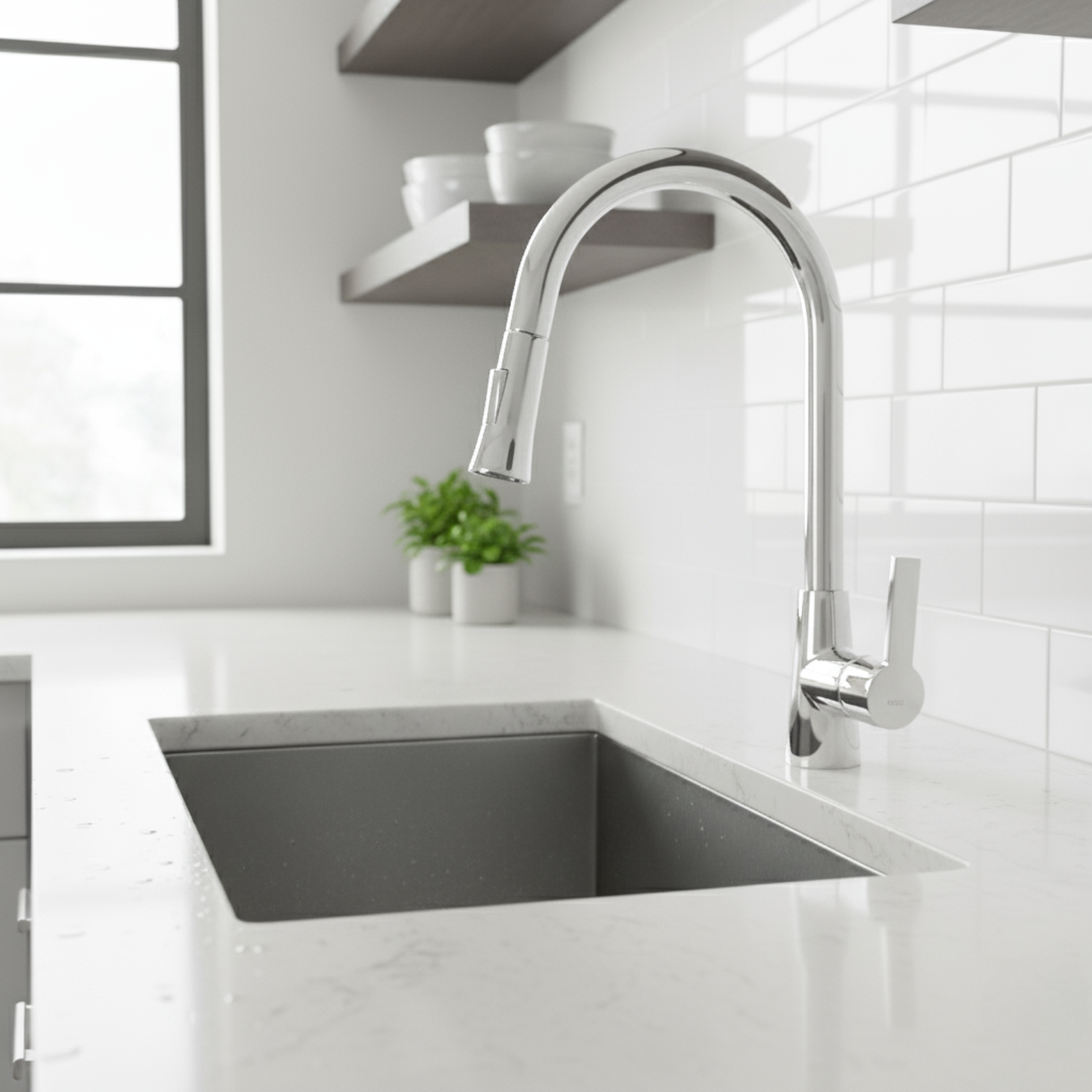 The LAVISH K115 Pull-Out Kitchen Faucet is designed for modern kitchens that demand both style and functionality. Crafted from premium brass, it ensures durability and resistance against rust and corrosion. The pull-out spray design makes dishwashing, rinsing, and sink cleaning effortless, while the single-handle lever allows for smooth water flow and temperature control. Equipped with a ceramic disc cartridge, it provides drip-free performance for years of use. The flexible supply lines with ³/₈″ or ⁹/₁₆″ compression fittings ensure easy installation, making this faucet an ideal upgrade for any simple kitchen space.