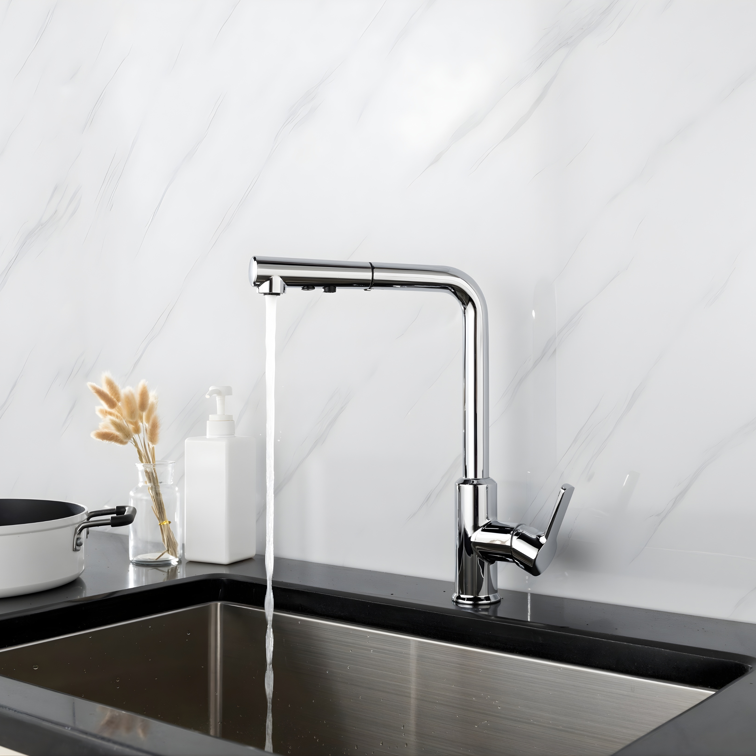 Upgrade your kitchen with the LAVISH K277 Pull-Out Kitchen Faucet. Made from high-quality brass, this faucet ensures long-lasting performance and corrosion resistance. The pull-out spout provides flexibility for washing dishes, filling pots, or cleaning the sink, while the ceramic disc cartridge guarantees smooth, leak-free operation. Flexible supply lines with ³/₈” or ⁹/₁₆” compression fittings make installation simple. The LAVISH K277 enhances modern kitchen décor while providing reliable, water-efficient performance.